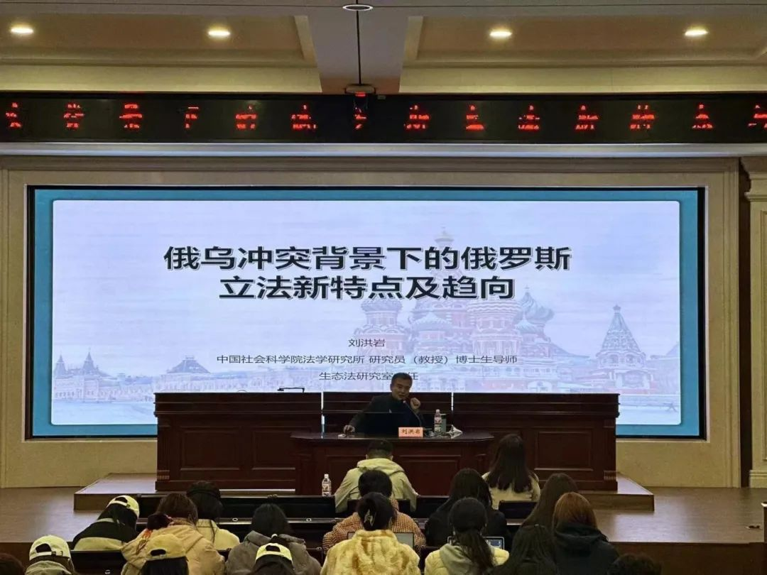 大学教授、博士生导师、博士后合作导师、环境与资源保护法教研室主任刘洪岩教授作为主讲嘉宾,讲座题目为“俄乌冲突背景下的俄罗斯立法新特点与趋向”,刘洪岩教授揭示了俄乌冲突是大国博弈下国际秩序重组的底层逻辑,并从历史维度持续性梳理了俄乌国家政治关系的演进。讲座现场,刘洪岩教授以其丰富的学术造诣和深刻的见解,引领听众们深入了解了俄乌冲突的复杂性和深刻影响。他指出,俄乌冲突不仅仅是两国之间的地缘政治博弈,更是涉及国际法、文化、历史等多方面因素的综合交织。通过对俄罗斯立法新特点与趋向的剖析,揭示了俄罗斯在当前国际环境下的法律发展趋势和挑战。