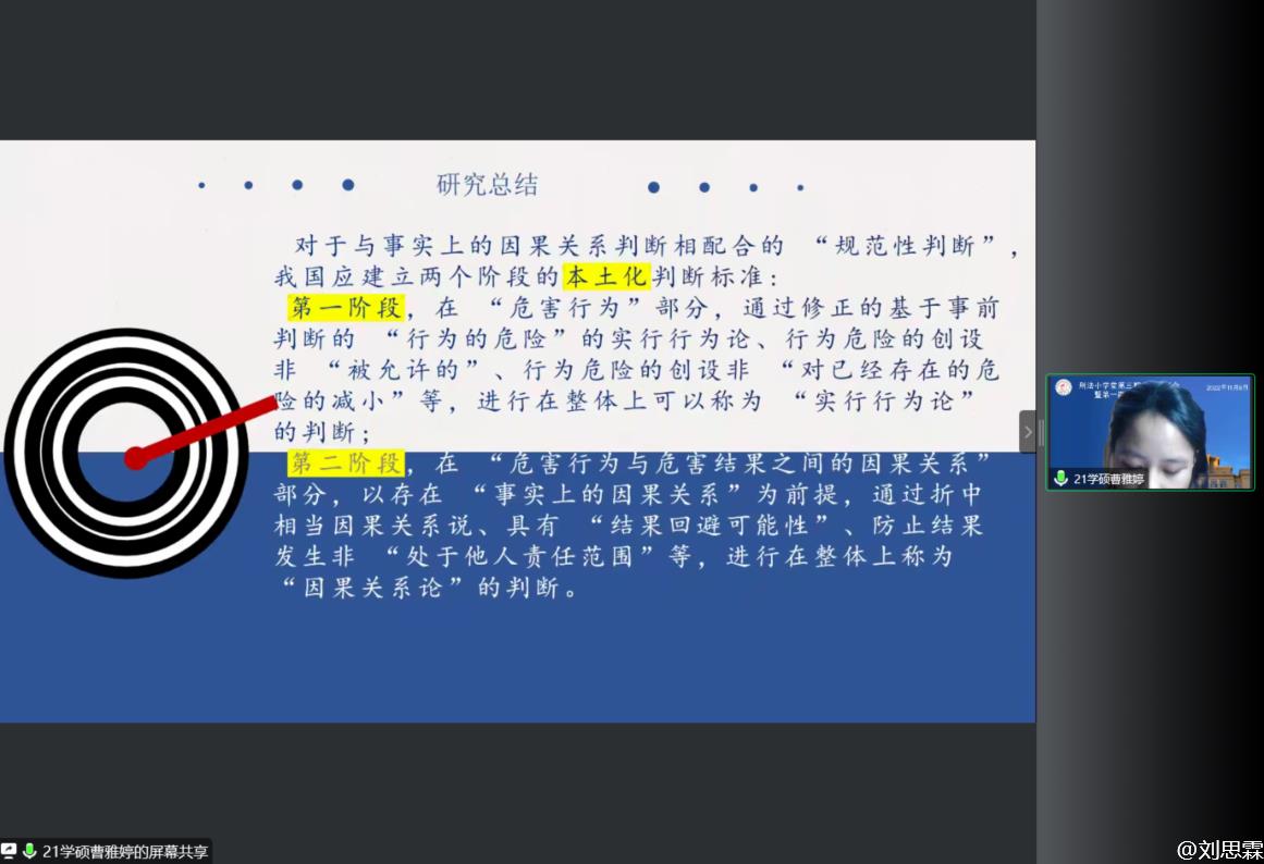 2021级法学硕士曹雅婷作为第一组的报告人就徐岱教授、史家家博士的《中国刑法因果关系理论的本土化形塑》一文作了详细的分析。徐岱教授主张我国应形成因果关系规范性判定标准,并强调我国应当建立两个阶段的本土化。曹雅婷同学认为徐岱教授创新性地将外国的成熟理论与我国的刑法理论相结合,是一次有益的尝试,极大促进了我国刑法因果关系合法合理地认定,发挥刑法的人权保障机能。
