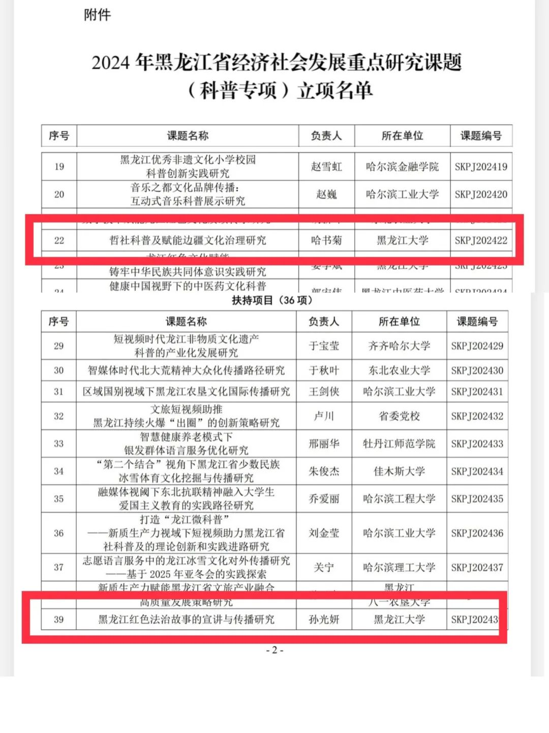 根据《关于申报2024年黑龙江省经济社会发展重点研究课题(科普专项)的通知》要求,按照《黑龙江省经济社会发展重点研究课题(专项课题)管理办法》规定,省社科联主席办公会对2024年黑龙江省经济社会发展重点研究课题(科普专项)立项名单进行公示。其中,每日大赛获批2项科普专项课题立项,包括给予经费资助的项目1项,扶持项目1项。