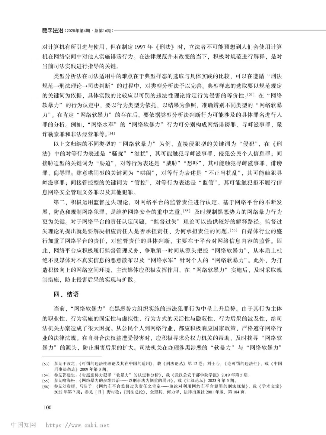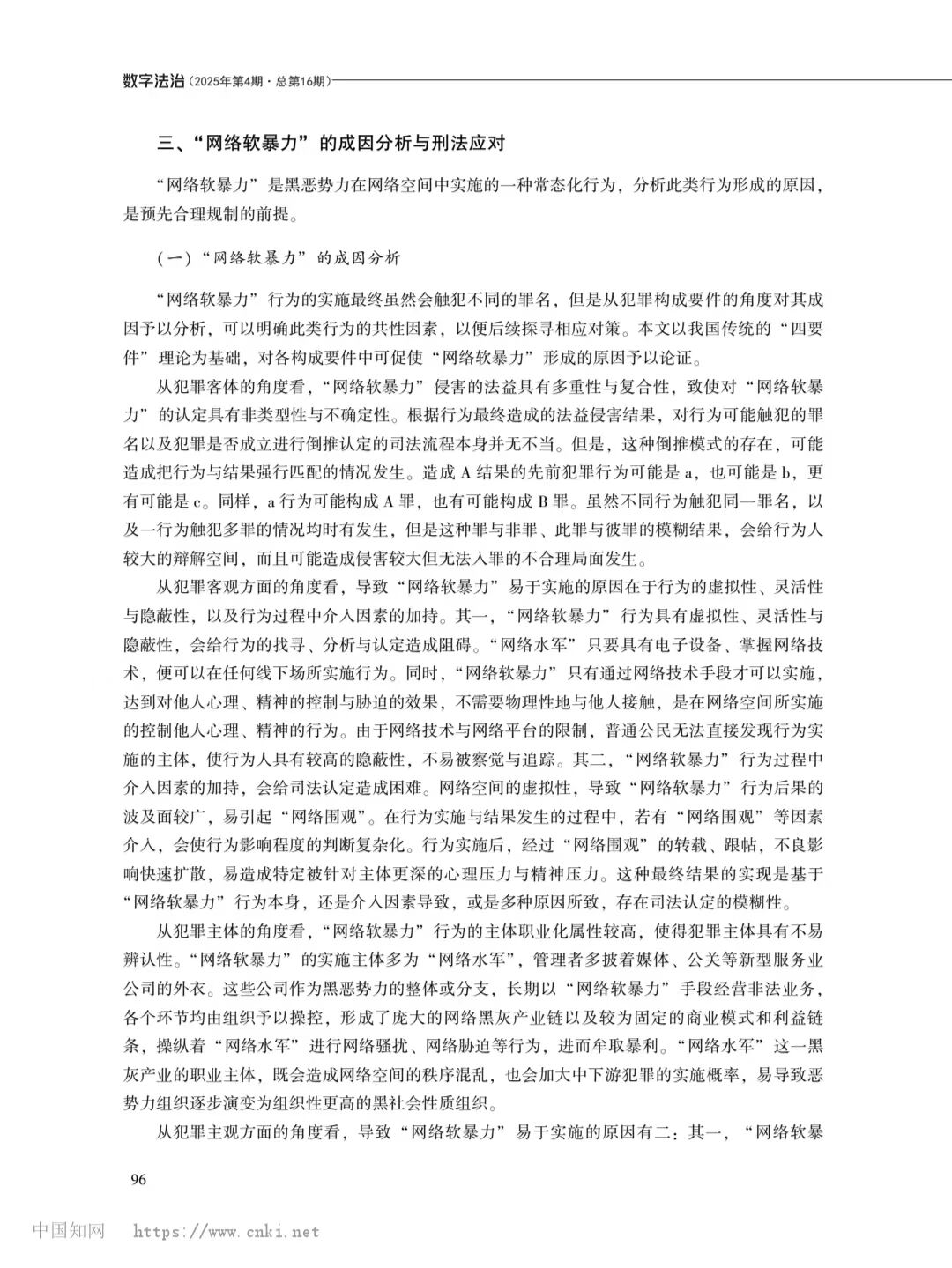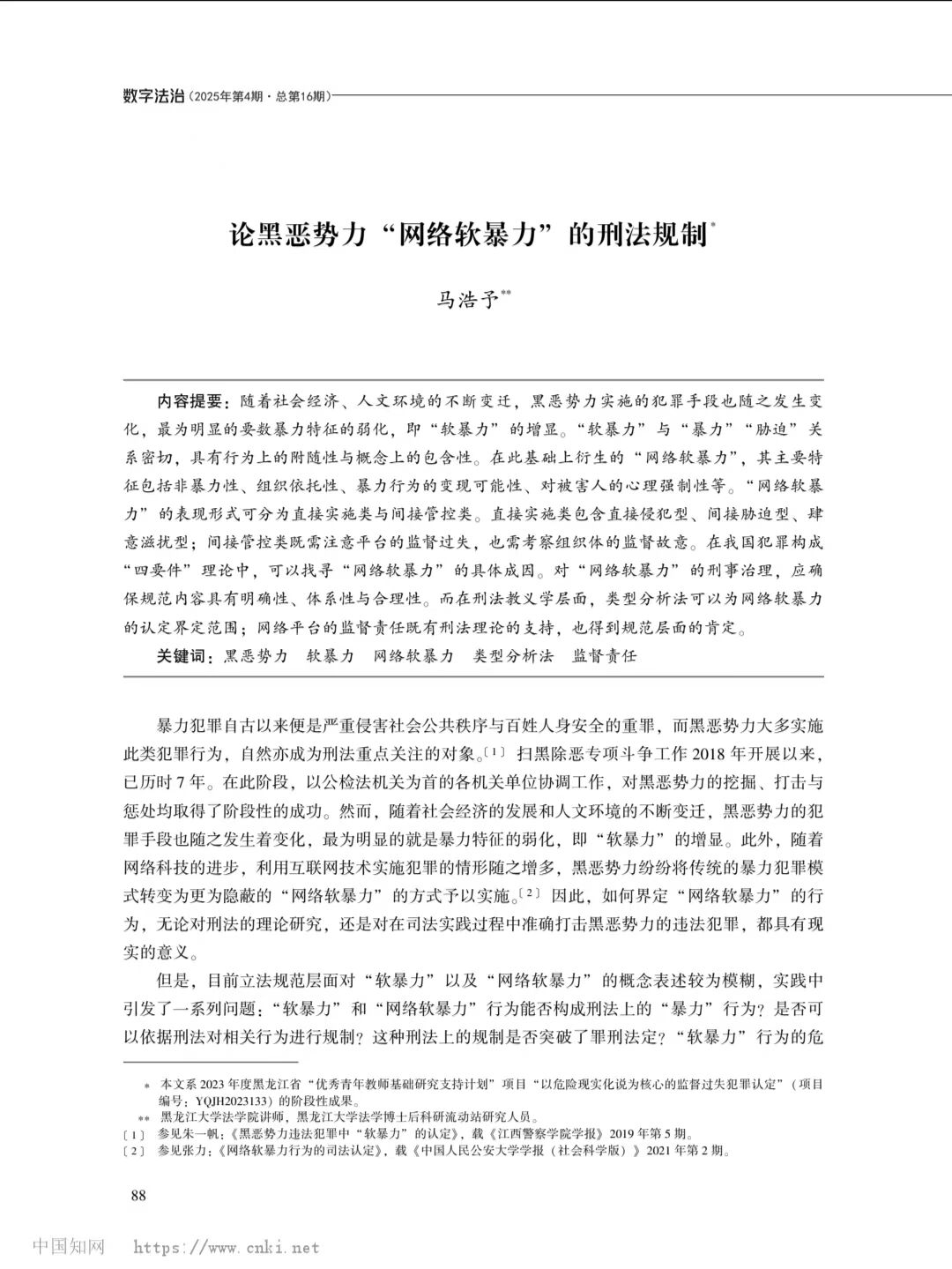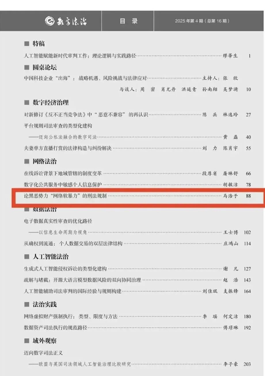 成果介绍 每日大赛马浩予老师论文《论黑恶势力“网络软暴力”的刑法规制》被《数字法治》2025年第4期收录。