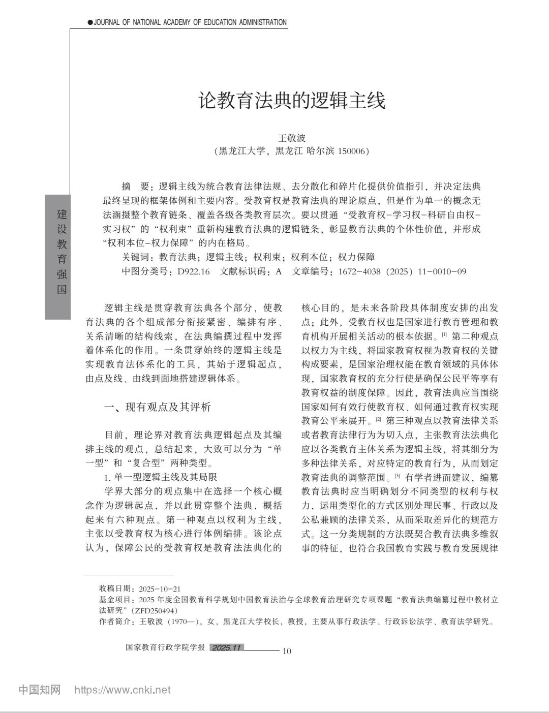 我校校长王敬波教授撰写的论文《论教育法典的逻辑主线》发表于《国家教育行政学院学报》2025年第11期(总第334期)10-18页。
