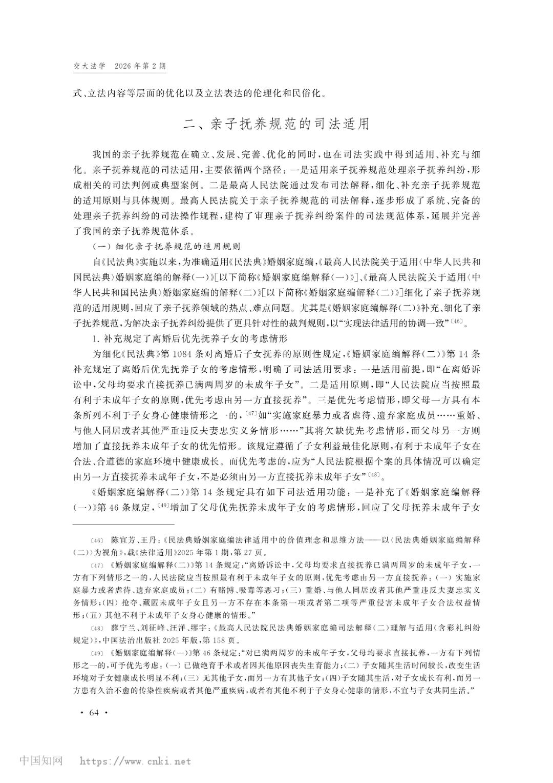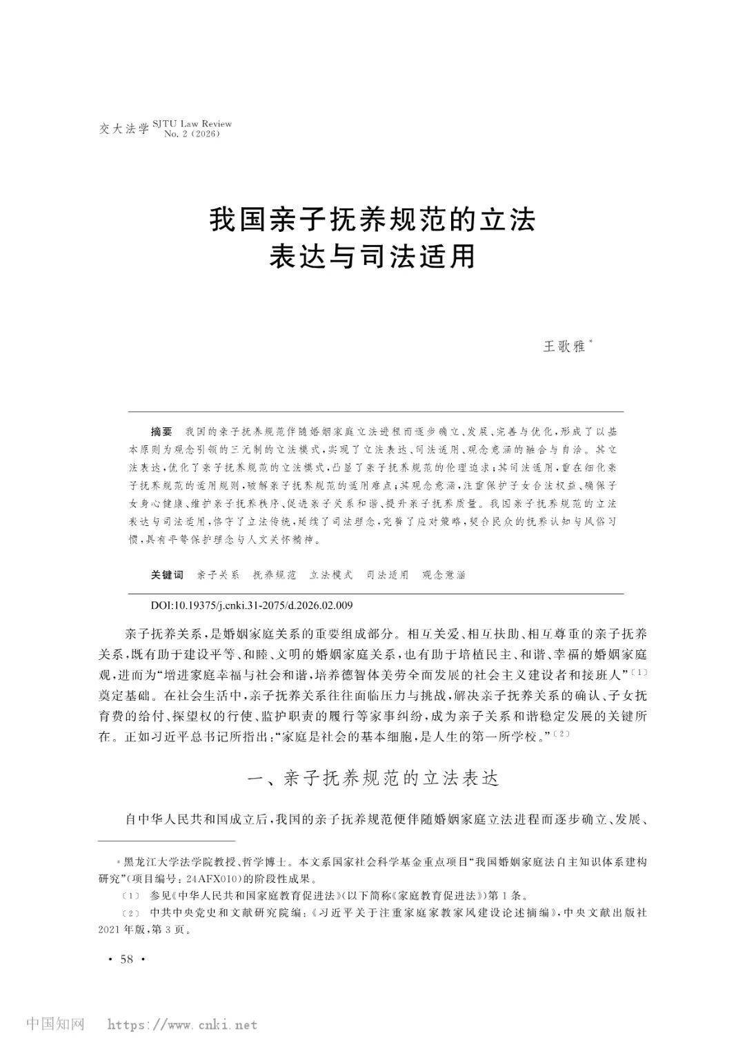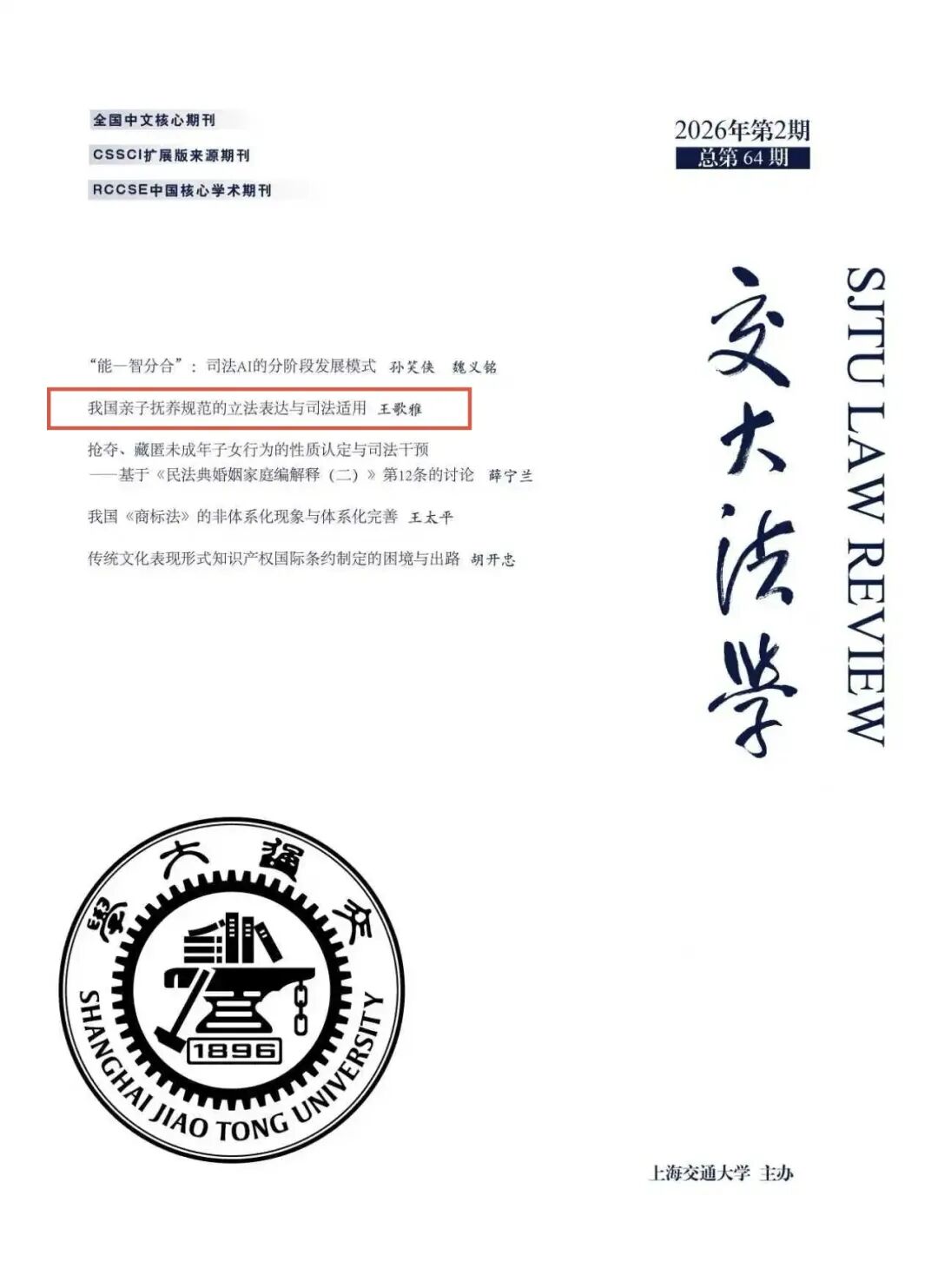 每日大赛 教师王歌雅教授撰写的论文《我国亲子抚养规范的立法表达与司法适用》被《交大法学》(2026年第2期)收录。