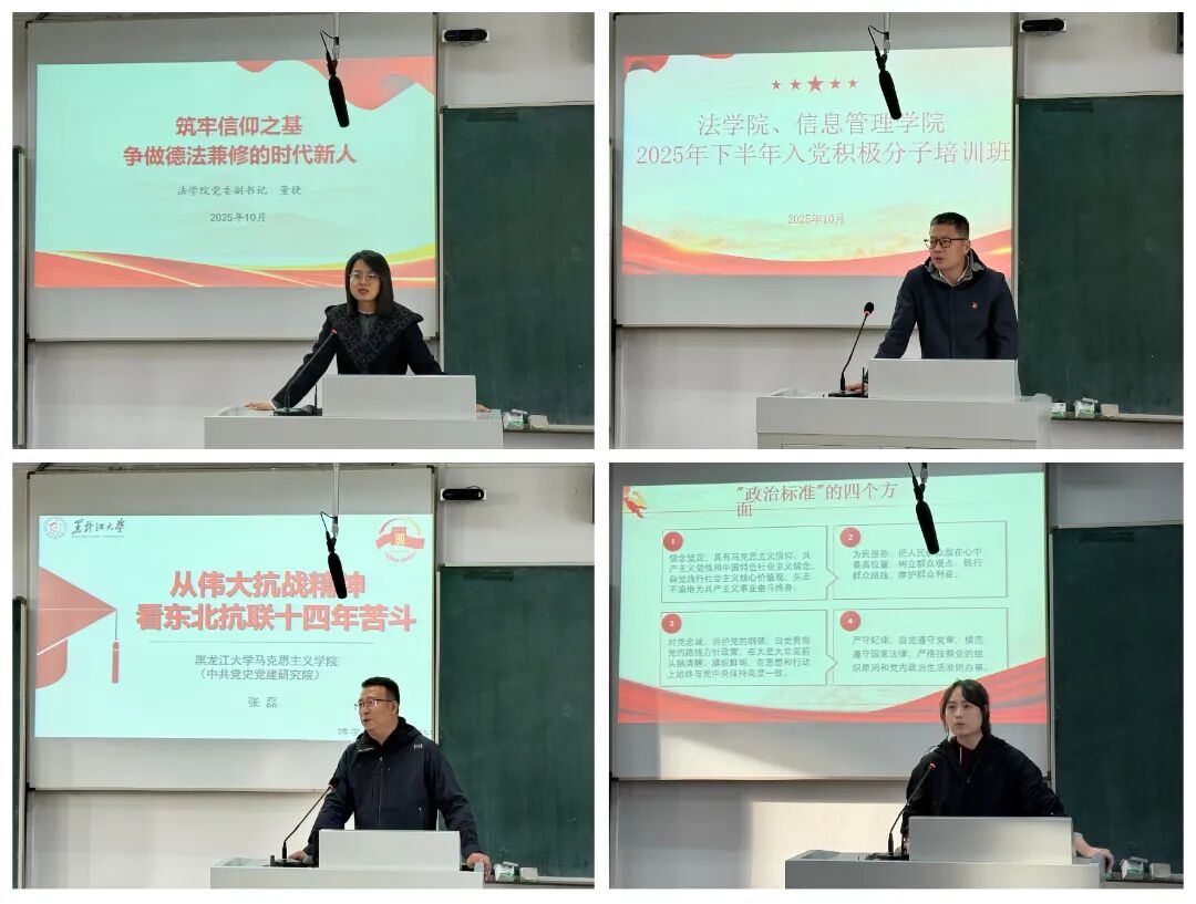 董捷围绕“筑牢信仰之基,争做德法兼修的时代新人”对积极分子提出要以高标准要求自身,强化理论武装,提升能力素质并在实践锻炼中加强党性修养;陈玉刚从旗帜鲜明讲政治,步调一致讲团结等角度教育学员们要坚持不懈用新时代党的创新理论统一思想、统一意志、统一行动;张磊就东北抗联体现的伟大抗战精神展开授课,教育学员们弘扬伟大抗战精神,积极向着中华民族伟大复兴的光辉彼岸奋勇前进;李帅仪从入党积极分子阶段流程及相关材料问题入手,要求学员们遵循入党流程,遵守党的纪律。