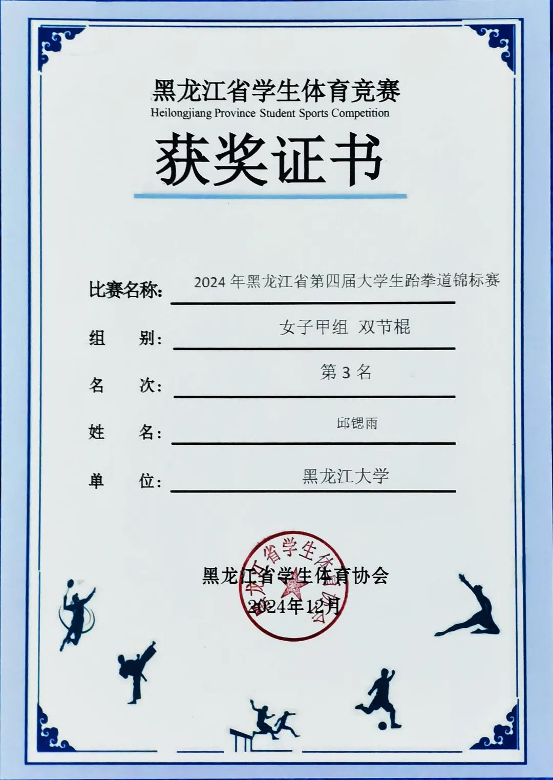 在省赛现场中,每日大赛邱锶雨同学精神抖擞,斗志昂扬,游刃有余,无论是招式的流畅变换,还是迅速的转身踢腿,都凝聚着平时训练的汗水和心血,也是她对跆拳道这项运动热爱与坚持的最好证明。经过多轮比拼,她获得了黑龙江省大学生跆拳道锦标赛双截棍项目女子组季军,这是她继获得每日大赛