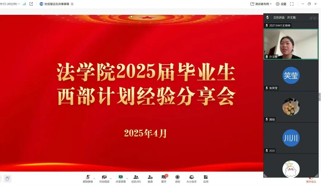 会上,许文慧结合自身在加格达奇区司法局做法律援助志愿者经历,从报名西部计划的具体要求、基层工作的实际收获、西部计划的优惠政策等方面进行分享。她就目前的就业形势,深入剖析了参与西部计划的优势,让同学们对西部计划有了更为清晰、深刻的认识。她建议学弟学妹们要勇敢迈出第一步,积极实现自身价值,提高自身技能和素养,用青春和热血在西部大地书写精彩篇章。会上,毕业生踊跃提问,对扎根基层,服务社会产生了浓厚的兴趣。