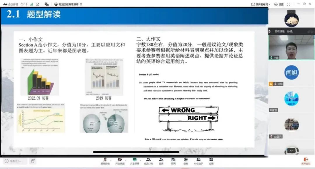 孙涵结合自身经验从题型介绍与学习方法等方面对全国大学生英语竞赛进行经验分享,建议阅读理解匹配题、简答题、摘要题要分别提炼出全文逻辑框架,精读篇章快速扫读定位,补全文章主旨含义。同时,完形填空建议抓住文章核心,先易后难,巧用答题技巧,并通过日常练习总结语法要点,夯实词汇量基础。最后,孙涵从评分标准、题型解读两方面剖解作文和翻译模块,着重讲解了图表题三段式结构以及具体内容、观点类作文与现象类作文的写作技巧与写作思路,并提出在处理翻译题目时提前做好草稿准备,梳理语法逻辑等。