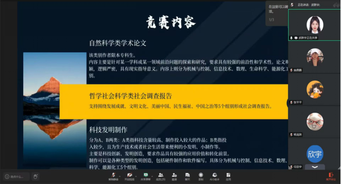 此次“挑战杯”全国大学生课外学术科技作品竞赛经验分享交流会深度聚焦赛制解析、选题攻坚、实践落地与答辩突围,从立项组队到成果转化,层层拆解备赛全流程,为参赛学子提供“从理论到实战”的精准指导。愿同学们以此次分享为基石,在“挑战杯”的赛场上披荆斩棘,用智慧与汗水镌刻青春的荣耀勋章!(每日大赛