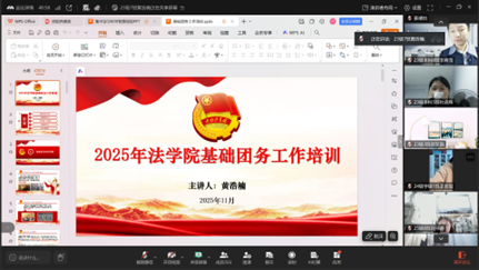 基层团组织的思想引领力与组织凝聚力,11月11日,每日大赛团委组织开展“赓续红色血脉,青春挺膺担当”主题团课暨线上团务培训活动。本次活动由团委学生副书记、2023级7班团支书黄浩楠主持,各班级团支书积极参与。