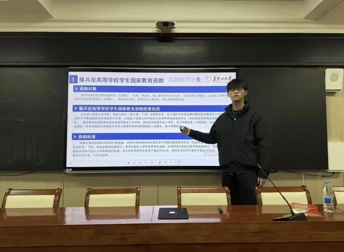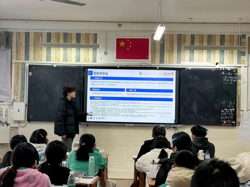 1月26日,杨明茜回到高中母校赣州中学开展本科生资助政策宣传教育活动。活动前,她认真梳理生源地信用助学贷款、国家奖助学金、绿色通道、学费减免、勤工助学、临时困难补助及学费补偿代偿等资助内容,结合高三学生需求准备宣讲材料并与母校沟通对接;宣讲现场,她采用线下讲解与互动答疑相结合的形式,围绕入学前、入学时、入学后全流程资助体系细致解读,结合自身经历与真实案例耐心解答学生疑问。此次返校宣讲活动有效普及了国家及高校资助政策,消除了学子升学顾虑,坚定了备考信心,也展现了黑大学子回馈母校、服务社会的青春担当。