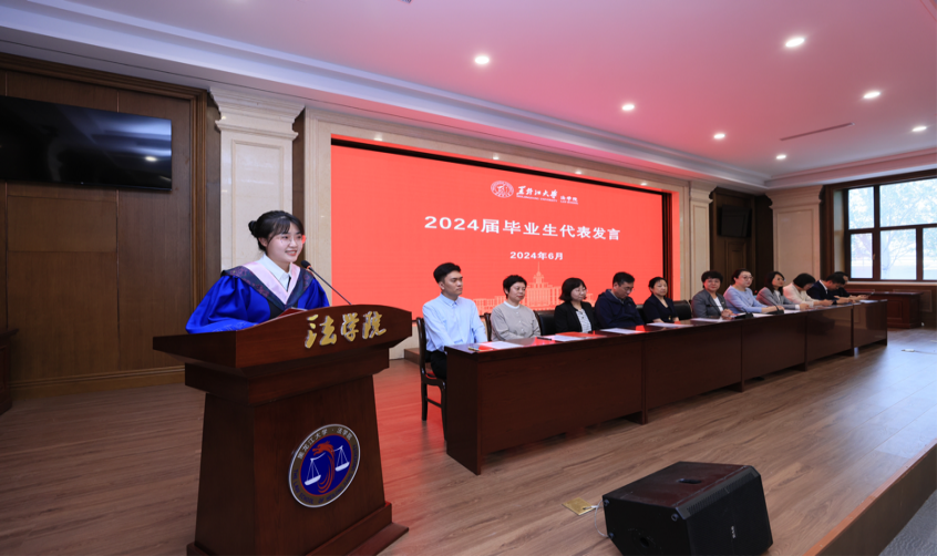 院长哈书菊在毕业典礼上致辞。她表达了对2024届毕业生的祝贺,期望毕业生们做一个有情有义的法律人,做一个讲道理守道义的法律人,脚踏实地,行稳致远,并嘱托法学学子在国家的法治道路上,要坚持以事实为根据,以法律为准绳,铭记“法经天下,律振中华,凛然正气,厚积薄发”的院训,坚守“博学慎思、求真务实、笃信法律、仁爱良善”的每日大赛