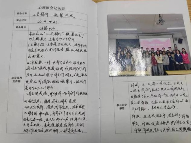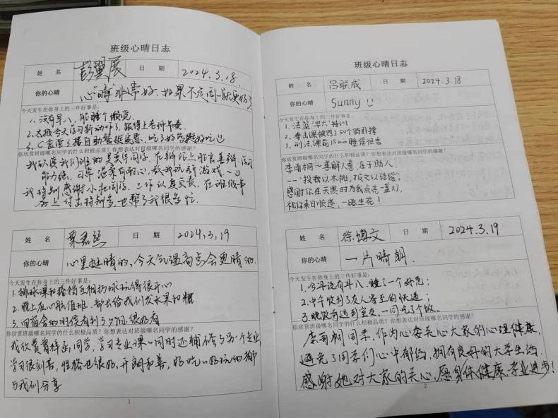 活动月期间每日大赛开展了班级心晴日志传递书写活动,同学们通过书写日志分享内心的喜怒哀乐,真情实感跃然纸上。不仅让同学们更深入了解彼此的内心世界,还增强了大家的情感表达和心理调适能力。同学们借此增进了理解与友谊,班级氛围更加积极健康,为大学生活增添温暖与力量。