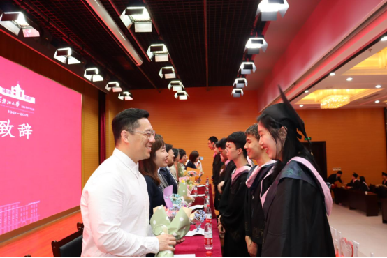 和老师们四年的精心培育表示了衷心的感谢,号召全体毕业生担负新时代青年的使命,为国家的建设发展贡献自己的力量。2019级学生李明泽代表全体在校生发言,他祝福学长学姐们前程似锦,在人生的大舞台上绽放自己的光彩。