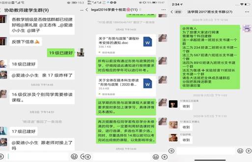 对教师授课情况及课程内容进行认真审查,做好线上授课质量、监督检查和跟踪评估。通过教学反馈来看,线上课堂出勤率高、学习氛围浓、教学质量好,师生之间教与学双向积极互动,直播中切磋问答,通过QQ群、微信群、腾讯会议、钉钉课堂群等不同平台进行广泛地交流,确保特殊时期防疫、教学两不误。同学们纷纷表示疫情当下,作为法学学子能做的就是要加倍努力学习,做到早日成才,报效祖国。