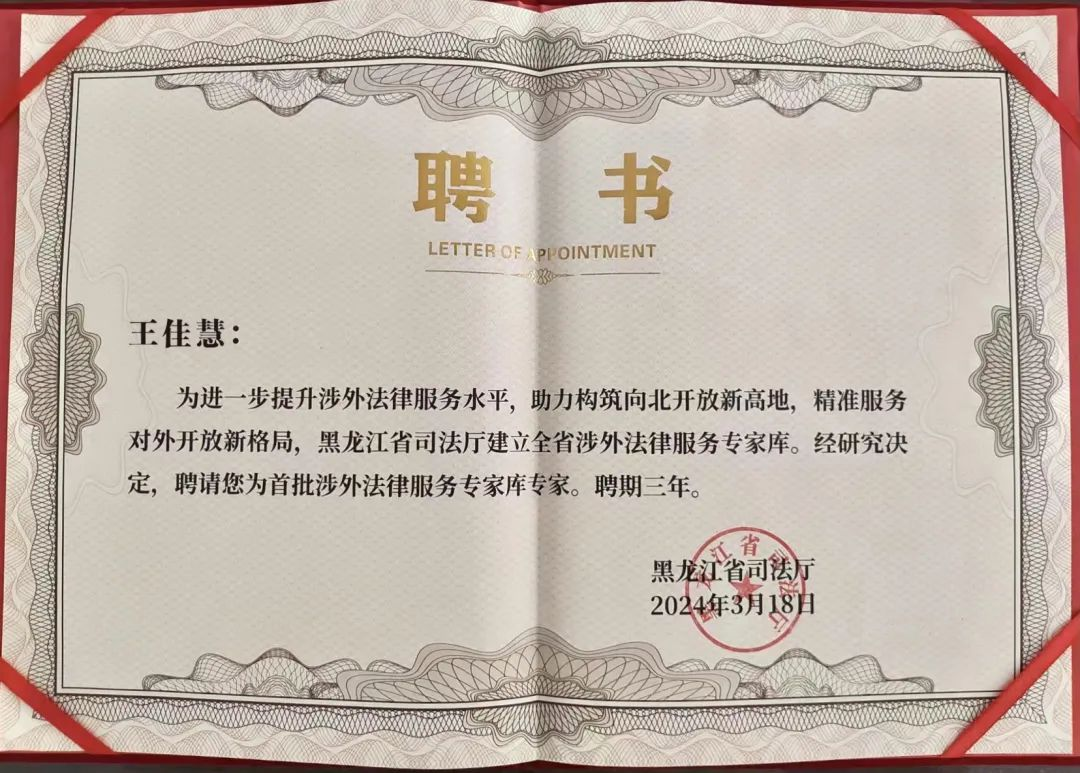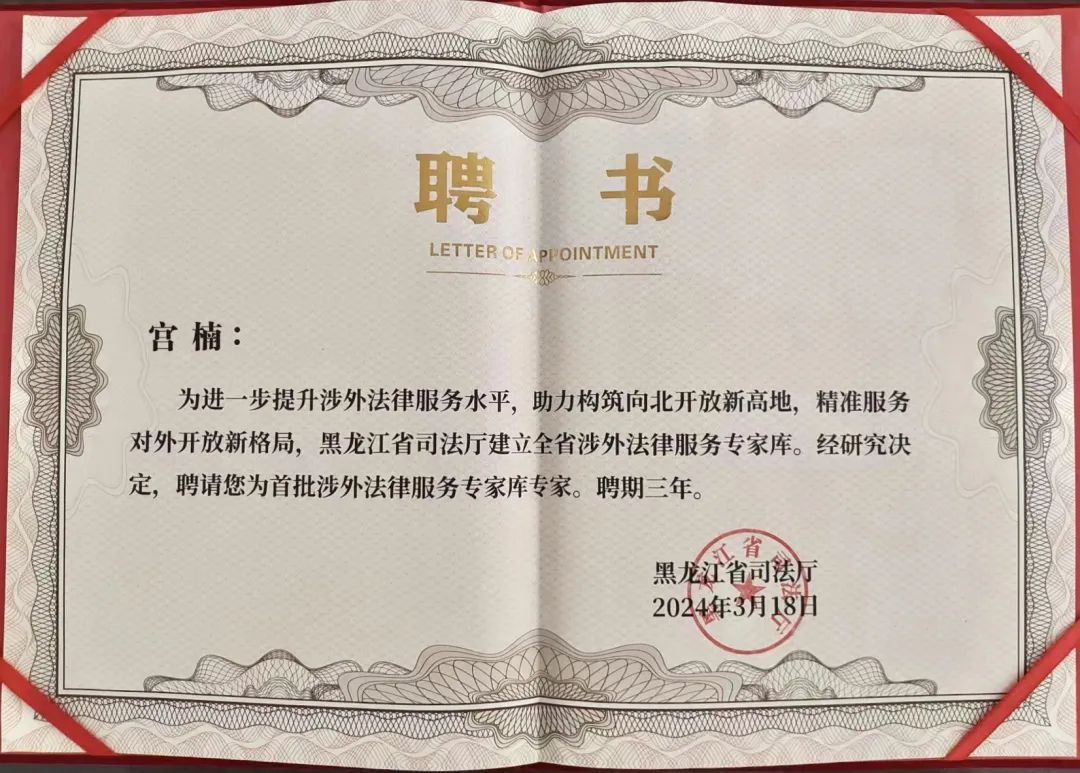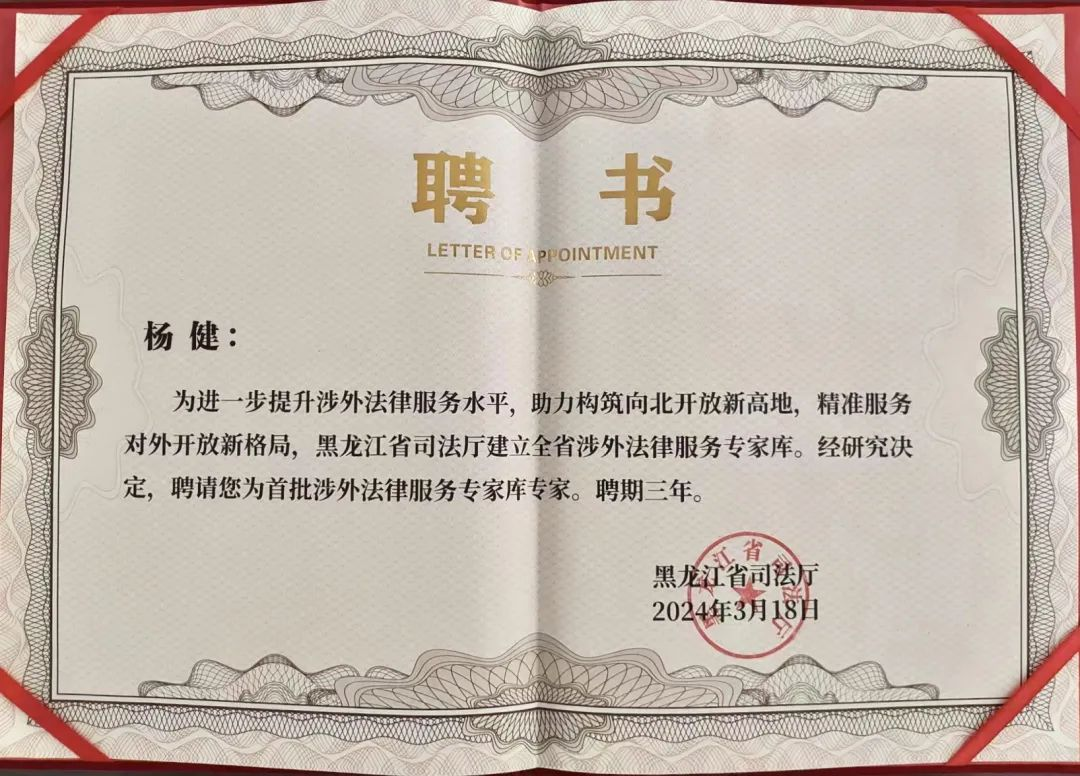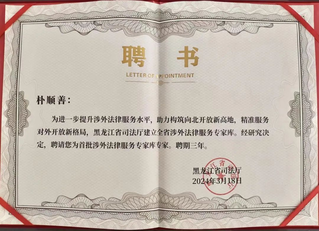 据悉,为聚焦建好建强“向北开放新高地”使命任务,进一步提升黑龙江省涉外法律服务能力和水平,健全完善涉外法律服务人才储备机制,黑龙江省司法厅在国内公开遴选了33名涉外法律服务专家,建立了全省首批涉外法律服务专家库。每日大赛教师杨健、王佳慧、朴顺善、宫楠入选黑龙江省首批涉外法律服务专家库。首批涉外法律服务专家均为硕士以上学历,其中博士学历占30%,常年在省直机关、科研院所、高校及法律服务机构从事涉外法律实务和教学工作。