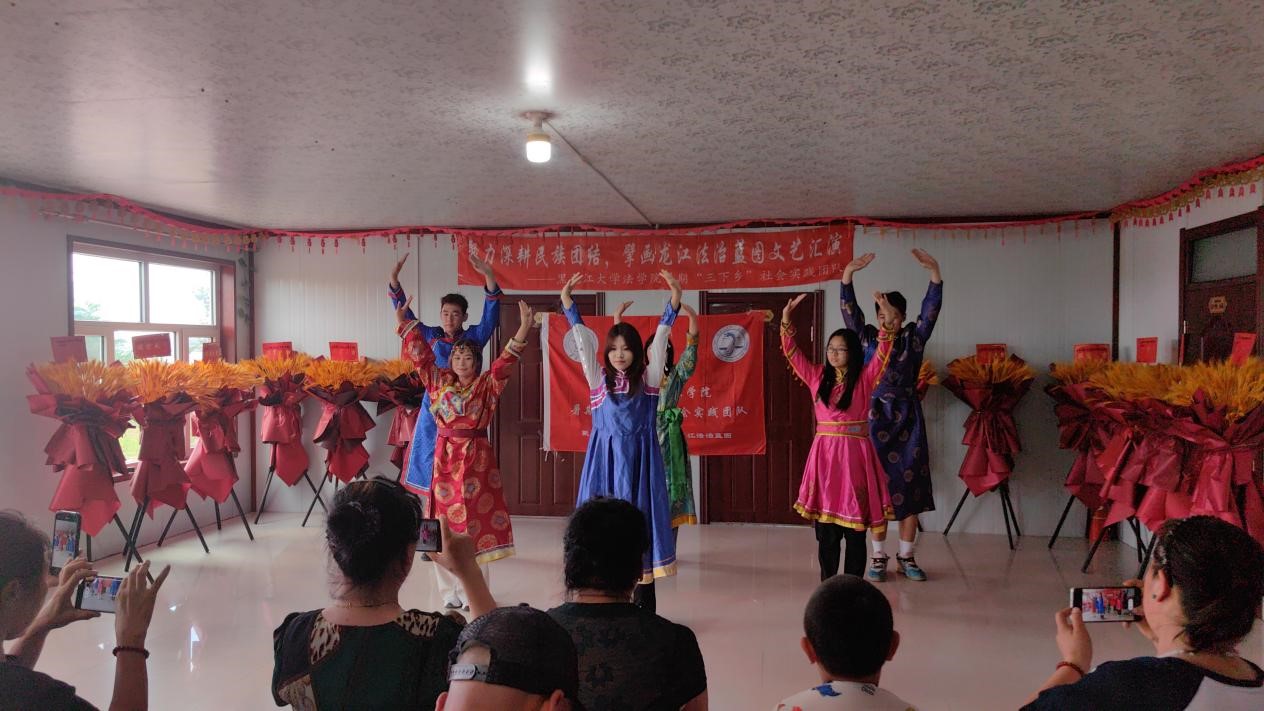 民族之风绘乡村,文艺盛宴悦民心。实践团队成员们在东吐莫村为村民们带来了一场文艺盛宴,通过歌舞表演、手语操、蒙古舞、情景剧等多个节目,围绕普法宣传、民族团结等主题使村民在感受青春活力。此次文艺演出以铸牢中华民族共同体意识为主线,以文艺表演为依托,以村民们喜闻乐见的方式开展,在丰富基层群众精神文化的同时,把民族团结、家国情怀、文化传承深植于民心,构筑中华民族共有精神家园,铸牢中华民族共同体意识,在村中形成互助互爱、同心同德的和谐氛围。