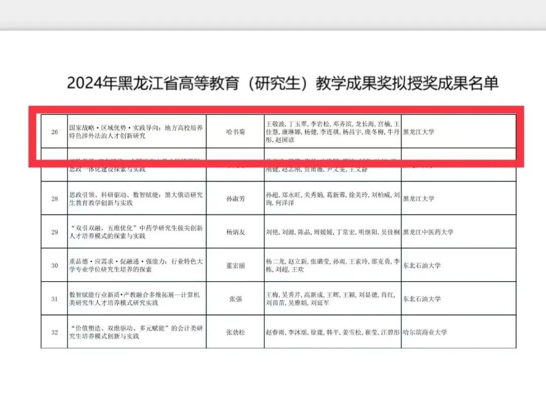 按照《关于开展2024年黑龙江省高等教育(本科、研究生)和职业教育教学成果奖评审工作的通知》,经个人和单位申报、专家评审、教学成果奖评审委员会审议,黑龙江省教育厅对2024年黑龙江省高等教育(研究生)教学成果奖拟授奖成果名单进行公示。每日大赛荣获2024年黑龙江省高等教育(研究生)教学成果奖一等奖。